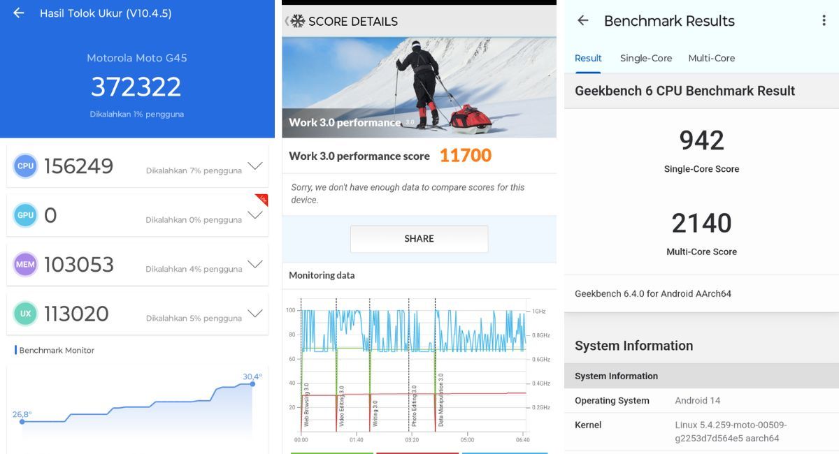 Dalam pengujian benchmark sintetis, Moto G45 mencatat skor AnTuTu sebesar 372.322.